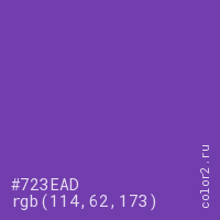 Цвет #723EAD в цветовой модели RGB обозначается тремя октетами (114, 62, 173) в десятичном формате и #723EAD в шестнадцатиричном (hex) формате, которые являются интенсивностью красного 114 (hex 72), интенсивность зелёного 62 (hex 3E) и интенсивность синего 173 (hex AD).