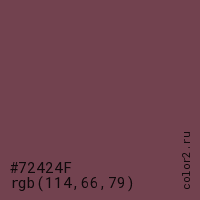 Цвет #72424F в цветовой модели RGB обозначается тремя октетами (114, 66, 79) в десятичном формате и #72424F в шестнадцатиричном (hex) формате, которые являются интенсивностью красного 114 (hex 72), интенсивность зелёного 66 (hex 42) и интенсивность синего 79 (hex 4F).