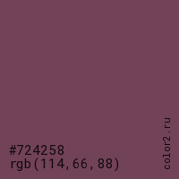 Цвет #724258 в цветовой модели RGB обозначается тремя октетами (114, 66, 88) в десятичном формате и #724258 в шестнадцатиричном (hex) формате, которые являются интенсивностью красного 114 (hex 72), интенсивность зелёного 66 (hex 42) и интенсивность синего 88 (hex 58).