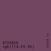 Цвет #724560 в цветовой модели RGB обозначается тремя октетами (114, 69, 96) в десятичном формате и #724560 в шестнадцатиричном (hex) формате, которые являются интенсивностью красного 114 (hex 72), интенсивность зелёного 69 (hex 45) и интенсивность синего 96 (hex 60).