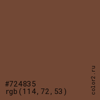 Цвет #724835 в цветовой модели RGB обозначается тремя октетами (114, 72, 53) в десятичном формате и #724835 в шестнадцатиричном (hex) формате, которые являются интенсивностью красного 114 (hex 72), интенсивность зелёного 72 (hex 48) и интенсивность синего 53 (hex 35).