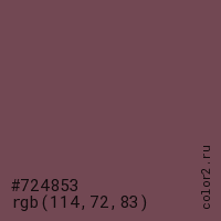 Цвет #724853 в цветовой модели RGB обозначается тремя октетами (114, 72, 83) в десятичном формате и #724853 в шестнадцатиричном (hex) формате, которые являются интенсивностью красного 114 (hex 72), интенсивность зелёного 72 (hex 48) и интенсивность синего 83 (hex 53).