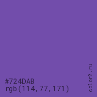 Цвет #724DAB в цветовой модели RGB обозначается тремя октетами (114, 77, 171) в десятичном формате и #724DAB в шестнадцатиричном (hex) формате, которые являются интенсивностью красного 114 (hex 72), интенсивность зелёного 77 (hex 4D) и интенсивность синего 171 (hex AB).
