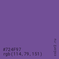 Цвет #724F97 в цветовой модели RGB обозначается тремя октетами (114, 79, 151) в десятичном формате и #724F97 в шестнадцатиричном (hex) формате, которые являются интенсивностью красного 114 (hex 72), интенсивность зелёного 79 (hex 4F) и интенсивность синего 151 (hex 97).
