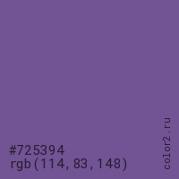 Цвет #725394 в цветовой модели RGB обозначается тремя октетами (114, 83, 148) в десятичном формате и #725394 в шестнадцатиричном (hex) формате, которые являются интенсивностью красного 114 (hex 72), интенсивность зелёного 83 (hex 53) и интенсивность синего 148 (hex 94).