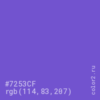 Цвет #7253CF в цветовой модели RGB обозначается тремя октетами (114, 83, 207) в десятичном формате и #7253CF в шестнадцатиричном (hex) формате, которые являются интенсивностью красного 114 (hex 72), интенсивность зелёного 83 (hex 53) и интенсивность синего 207 (hex CF).