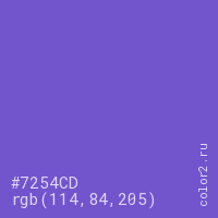 Цвет #7254CD в цветовой модели RGB обозначается тремя октетами (114, 84, 205) в десятичном формате и #7254CD в шестнадцатиричном (hex) формате, которые являются интенсивностью красного 114 (hex 72), интенсивность зелёного 84 (hex 54) и интенсивность синего 205 (hex CD).
