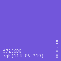 Цвет #7256DB в цветовой модели RGB обозначается тремя октетами (114, 86, 219) в десятичном формате и #7256DB в шестнадцатиричном (hex) формате, которые являются интенсивностью красного 114 (hex 72), интенсивность зелёного 86 (hex 56) и интенсивность синего 219 (hex DB).
