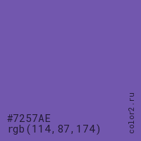 Цвет #7257AE в цветовой модели RGB обозначается тремя октетами (114, 87, 174) в десятичном формате и #7257AE в шестнадцатиричном (hex) формате, которые являются интенсивностью красного 114 (hex 72), интенсивность зелёного 87 (hex 57) и интенсивность синего 174 (hex AE).