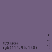 Цвет #725F80 в цветовой модели RGB обозначается тремя октетами (114, 95, 128) в десятичном формате и #725F80 в шестнадцатиричном (hex) формате, которые являются интенсивностью красного 114 (hex 72), интенсивность зелёного 95 (hex 5F) и интенсивность синего 128 (hex 80).