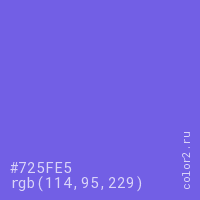 Цвет #725FE5 в цветовой модели RGB обозначается тремя октетами (114, 95, 229) в десятичном формате и #725FE5 в шестнадцатиричном (hex) формате, которые являются интенсивностью красного 114 (hex 72), интенсивность зелёного 95 (hex 5F) и интенсивность синего 229 (hex E5).