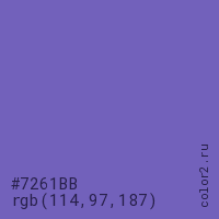 Цвет #7261BB в цветовой модели RGB обозначается тремя октетами (114, 97, 187) в десятичном формате и #7261BB в шестнадцатиричном (hex) формате, которые являются интенсивностью красного 114 (hex 72), интенсивность зелёного 97 (hex 61) и интенсивность синего 187 (hex BB).
