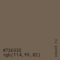 Цвет #726352 в цветовой модели RGB обозначается тремя октетами (114, 99, 82) в десятичном формате и #726352 в шестнадцатиричном (hex) формате, которые являются интенсивностью красного 114 (hex 72), интенсивность зелёного 99 (hex 63) и интенсивность синего 82 (hex 52).