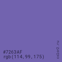 Цвет #7263AF в цветовой модели RGB обозначается тремя октетами (114, 99, 175) в десятичном формате и #7263AF в шестнадцатиричном (hex) формате, которые являются интенсивностью красного 114 (hex 72), интенсивность зелёного 99 (hex 63) и интенсивность синего 175 (hex AF).