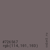 Цвет #726567 в цветовой модели RGB обозначается тремя октетами (114, 101, 103) в десятичном формате и #726567 в шестнадцатиричном (hex) формате, которые являются интенсивностью красного 114 (hex 72), интенсивность зелёного 101 (hex 65) и интенсивность синего 103 (hex 67).
