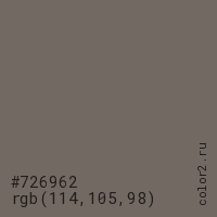 Цвет #726962 в цветовой модели RGB обозначается тремя октетами (114, 105, 98) в десятичном формате и #726962 в шестнадцатиричном (hex) формате, которые являются интенсивностью красного 114 (hex 72), интенсивность зелёного 105 (hex 69) и интенсивность синего 98 (hex 62).