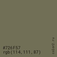 Цвет #726F57 в цветовой модели RGB обозначается тремя октетами (114, 111, 87) в десятичном формате и #726F57 в шестнадцатиричном (hex) формате, которые являются интенсивностью красного 114 (hex 72), интенсивность зелёного 111 (hex 6F) и интенсивность синего 87 (hex 57).