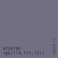 Цвет #726F83 в цветовой модели RGB обозначается тремя октетами (114, 111, 131) в десятичном формате и #726F83 в шестнадцатиричном (hex) формате, которые являются интенсивностью красного 114 (hex 72), интенсивность зелёного 111 (hex 6F) и интенсивность синего 131 (hex 83).