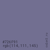 Цвет #726F91 в цветовой модели RGB обозначается тремя октетами (114, 111, 145) в десятичном формате и #726F91 в шестнадцатиричном (hex) формате, которые являются интенсивностью красного 114 (hex 72), интенсивность зелёного 111 (hex 6F) и интенсивность синего 145 (hex 91).