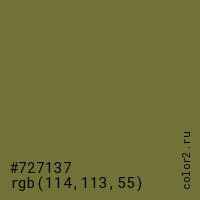 Цвет #727137 в цветовой модели RGB обозначается тремя октетами (114, 113, 55) в десятичном формате и #727137 в шестнадцатиричном (hex) формате, которые являются интенсивностью красного 114 (hex 72), интенсивность зелёного 113 (hex 71) и интенсивность синего 55 (hex 37).