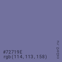 Цвет #72719E в цветовой модели RGB обозначается тремя октетами (114, 113, 158) в десятичном формате и #72719E в шестнадцатиричном (hex) формате, которые являются интенсивностью красного 114 (hex 72), интенсивность зелёного 113 (hex 71) и интенсивность синего 158 (hex 9E).