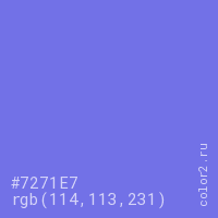Цвет #7271E7 в цветовой модели RGB обозначается тремя октетами (114, 113, 231) в десятичном формате и #7271E7 в шестнадцатиричном (hex) формате, которые являются интенсивностью красного 114 (hex 72), интенсивность зелёного 113 (hex 71) и интенсивность синего 231 (hex E7).