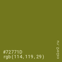 Цвет #72771D в цветовой модели RGB обозначается тремя октетами (114, 119, 29) в десятичном формате и #72771D в шестнадцатиричном (hex) формате, которые являются интенсивностью красного 114 (hex 72), интенсивность зелёного 119 (hex 77) и интенсивность синего 29 (hex 1D).
