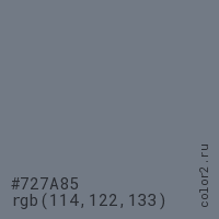 Цвет #727A85 в цветовой модели RGB обозначается тремя октетами (114, 122, 133) в десятичном формате и #727A85 в шестнадцатиричном (hex) формате, которые являются интенсивностью красного 114 (hex 72), интенсивность зелёного 122 (hex 7A) и интенсивность синего 133 (hex 85).