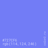 Цвет #727CF6 в цветовой модели RGB обозначается тремя октетами (114, 124, 246) в десятичном формате и #727CF6 в шестнадцатиричном (hex) формате, которые являются интенсивностью красного 114 (hex 72), интенсивность зелёного 124 (hex 7C) и интенсивность синего 246 (hex F6).