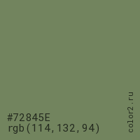 Цвет #72845E в цветовой модели RGB обозначается тремя октетами (114, 132, 94) в десятичном формате и #72845E в шестнадцатиричном (hex) формате, которые являются интенсивностью красного 114 (hex 72), интенсивность зелёного 132 (hex 84) и интенсивность синего 94 (hex 5E).