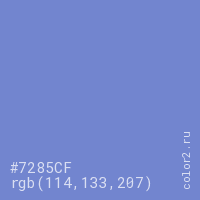 Цвет #7285CF в цветовой модели RGB обозначается тремя октетами (114, 133, 207) в десятичном формате и #7285CF в шестнадцатиричном (hex) формате, которые являются интенсивностью красного 114 (hex 72), интенсивность зелёного 133 (hex 85) и интенсивность синего 207 (hex CF).