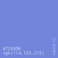 Цвет #7285DB в цветовой модели RGB обозначается тремя октетами (114, 133, 219) в десятичном формате и #7285DB в шестнадцатиричном (hex) формате, которые являются интенсивностью красного 114 (hex 72), интенсивность зелёного 133 (hex 85) и интенсивность синего 219 (hex DB).