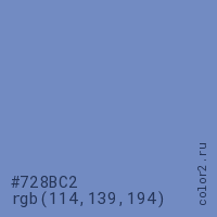 Цвет #728BC2 в цветовой модели RGB обозначается тремя октетами (114, 139, 194) в десятичном формате и #728BC2 в шестнадцатиричном (hex) формате, которые являются интенсивностью красного 114 (hex 72), интенсивность зелёного 139 (hex 8B) и интенсивность синего 194 (hex C2).