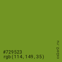 Цвет #729523 в цветовой модели RGB обозначается тремя октетами (114, 149, 35) в десятичном формате и #729523 в шестнадцатиричном (hex) формате, которые являются интенсивностью красного 114 (hex 72), интенсивность зелёного 149 (hex 95) и интенсивность синего 35 (hex 23).