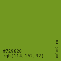 Цвет #729820 в цветовой модели RGB обозначается тремя октетами (114, 152, 32) в десятичном формате и #729820 в шестнадцатиричном (hex) формате, которые являются интенсивностью красного 114 (hex 72), интенсивность зелёного 152 (hex 98) и интенсивность синего 32 (hex 20).
