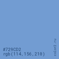 Цвет #729CD2 в цветовой модели RGB обозначается тремя октетами (114, 156, 210) в десятичном формате и #729CD2 в шестнадцатиричном (hex) формате, которые являются интенсивностью красного 114 (hex 72), интенсивность зелёного 156 (hex 9C) и интенсивность синего 210 (hex D2).