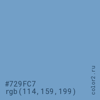 Цвет #729FC7 в цветовой модели RGB обозначается тремя октетами (114, 159, 199) в десятичном формате и #729FC7 в шестнадцатиричном (hex) формате, которые являются интенсивностью красного 114 (hex 72), интенсивность зелёного 159 (hex 9F) и интенсивность синего 199 (hex C7).