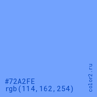 Цвет #72A2FE в цветовой модели RGB обозначается тремя октетами (114, 162, 254) в десятичном формате и #72A2FE в шестнадцатиричном (hex) формате, которые являются интенсивностью красного 114 (hex 72), интенсивность зелёного 162 (hex A2) и интенсивность синего 254 (hex FE).