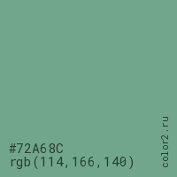 Цвет #72A68C в цветовой модели RGB обозначается тремя октетами (114, 166, 140) в десятичном формате и #72A68C в шестнадцатиричном (hex) формате, которые являются интенсивностью красного 114 (hex 72), интенсивность зелёного 166 (hex A6) и интенсивность синего 140 (hex 8C).