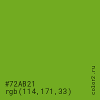 Цвет #72AB21 в цветовой модели RGB обозначается тремя октетами (114, 171, 33) в десятичном формате и #72AB21 в шестнадцатиричном (hex) формате, которые являются интенсивностью красного 114 (hex 72), интенсивность зелёного 171 (hex AB) и интенсивность синего 33 (hex 21).
