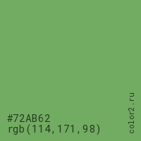 Цвет #72AB62 в цветовой модели RGB обозначается тремя октетами (114, 171, 98) в десятичном формате и #72AB62 в шестнадцатиричном (hex) формате, которые являются интенсивностью красного 114 (hex 72), интенсивность зелёного 171 (hex AB) и интенсивность синего 98 (hex 62).