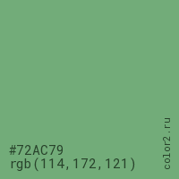 Цвет #72AC79 в цветовой модели RGB обозначается тремя октетами (114, 172, 121) в десятичном формате и #72AC79 в шестнадцатиричном (hex) формате, которые являются интенсивностью красного 114 (hex 72), интенсивность зелёного 172 (hex AC) и интенсивность синего 121 (hex 79).