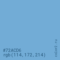 Цвет #72ACD6 в цветовой модели RGB обозначается тремя октетами (114, 172, 214) в десятичном формате и #72ACD6 в шестнадцатиричном (hex) формате, которые являются интенсивностью красного 114 (hex 72), интенсивность зелёного 172 (hex AC) и интенсивность синего 214 (hex D6).