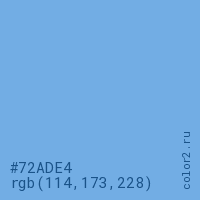 Цвет #72ADE4 в цветовой модели RGB обозначается тремя октетами (114, 173, 228) в десятичном формате и #72ADE4 в шестнадцатиричном (hex) формате, которые являются интенсивностью красного 114 (hex 72), интенсивность зелёного 173 (hex AD) и интенсивность синего 228 (hex E4).