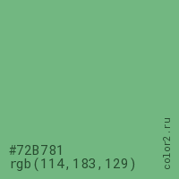 Цвет #72B781 в цветовой модели RGB обозначается тремя октетами (114, 183, 129) в десятичном формате и #72B781 в шестнадцатиричном (hex) формате, которые являются интенсивностью красного 114 (hex 72), интенсивность зелёного 183 (hex B7) и интенсивность синего 129 (hex 81).