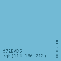 Цвет #72BAD5 в цветовой модели RGB обозначается тремя октетами (114, 186, 213) в десятичном формате и #72BAD5 в шестнадцатиричном (hex) формате, которые являются интенсивностью красного 114 (hex 72), интенсивность зелёного 186 (hex BA) и интенсивность синего 213 (hex D5).