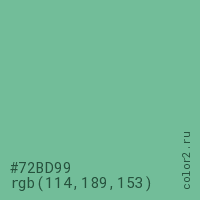 Цвет #72BD99 в цветовой модели RGB обозначается тремя октетами (114, 189, 153) в десятичном формате и #72BD99 в шестнадцатиричном (hex) формате, которые являются интенсивностью красного 114 (hex 72), интенсивность зелёного 189 (hex BD) и интенсивность синего 153 (hex 99).