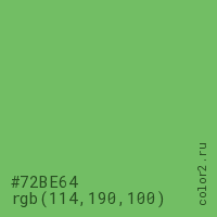 Цвет #72BE64 в цветовой модели RGB обозначается тремя октетами (114, 190, 100) в десятичном формате и #72BE64 в шестнадцатиричном (hex) формате, которые являются интенсивностью красного 114 (hex 72), интенсивность зелёного 190 (hex BE) и интенсивность синего 100 (hex 64).