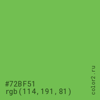 Цвет #72BF51 в цветовой модели RGB обозначается тремя октетами (114, 191, 81) в десятичном формате и #72BF51 в шестнадцатиричном (hex) формате, которые являются интенсивностью красного 114 (hex 72), интенсивность зелёного 191 (hex BF) и интенсивность синего 81 (hex 51).