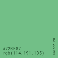Цвет #72BF87 в цветовой модели RGB обозначается тремя октетами (114, 191, 135) в десятичном формате и #72BF87 в шестнадцатиричном (hex) формате, которые являются интенсивностью красного 114 (hex 72), интенсивность зелёного 191 (hex BF) и интенсивность синего 135 (hex 87).